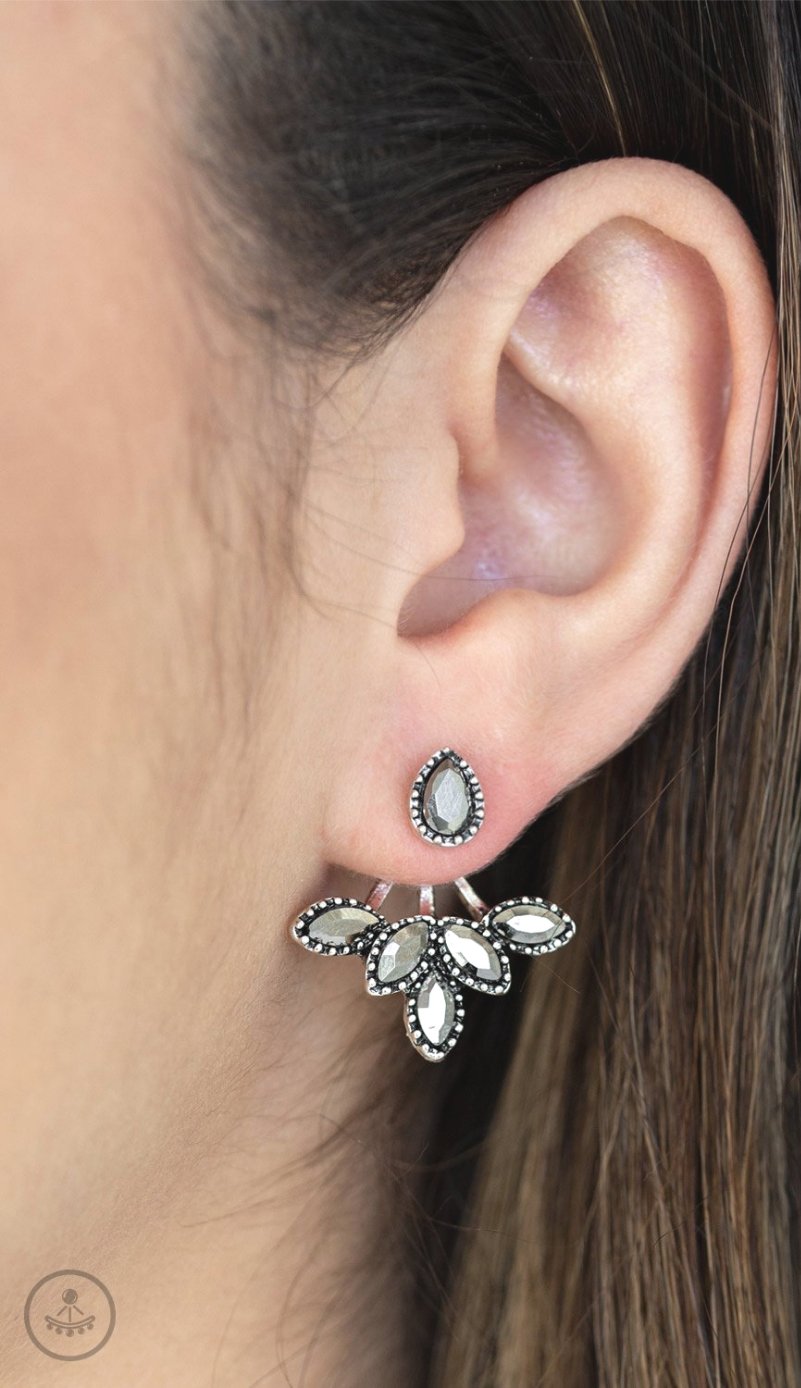 Solitaire teardrop hematite rhinestone attaches to a double sided post