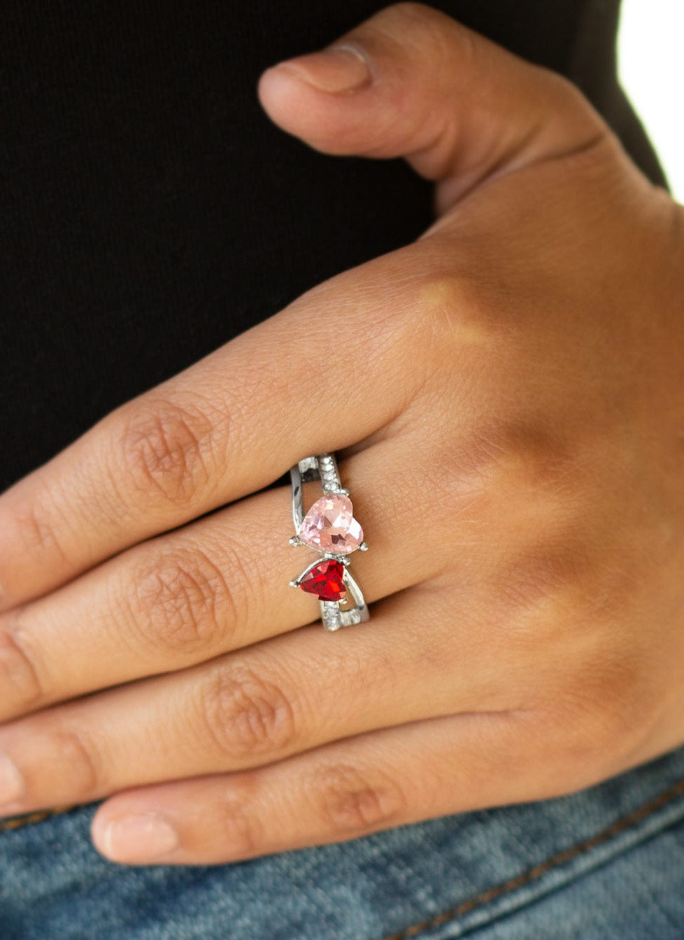 Infused with dainty white rhinestone encrusted silver bands, pink and red heart-shape rhinestones delicately come together at the center of the finger. Features a dainty stretchy band for a flexible fit.
