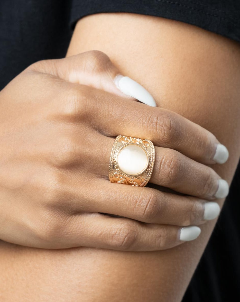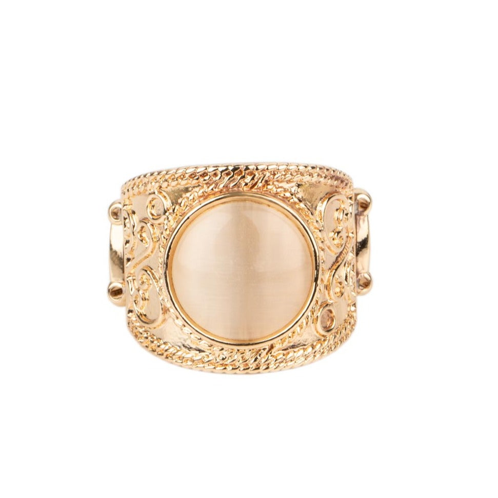 A glassy cat's eye stone is pressed into the center of a wide shiny gold band. The engraved rope-like edges create a frame filled with whimsical floral motifs for a romantic centerpiece atop the finger. Features a stretchy band for a flexible fit.
