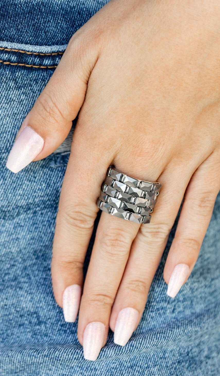 Featuring a flashy faceted surface, staggered rows of rectangular hematite rhinestones alternate with shiny silver bar-like accents across a thick silver band for a gritty-glamorous statement atop the finger. Features a stretchy band for a flexible fit.