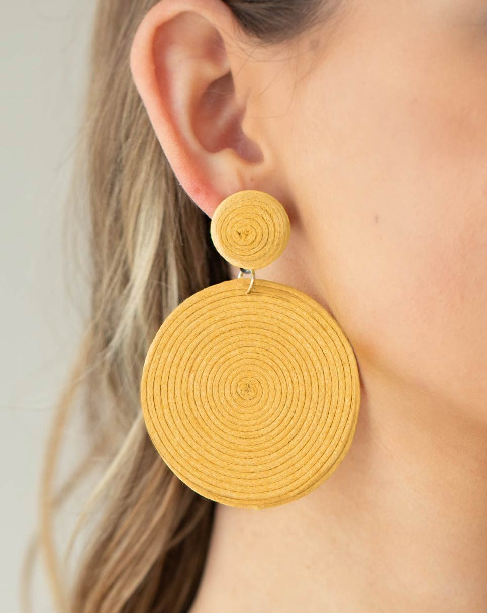 A generous disc of yellow thread spirals around and around for a dizzying finish as it connects to a yellow threaded button post. Earring attaches to a standard post fitting.