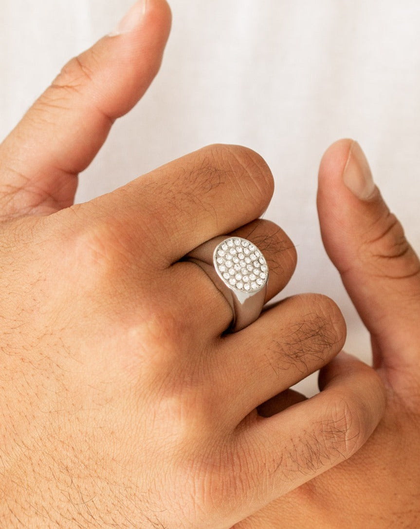 Glassy white rhinestones are encrusted atop a flattened circular frame for a statement look. Features a stretchy band for a flexible fit.
