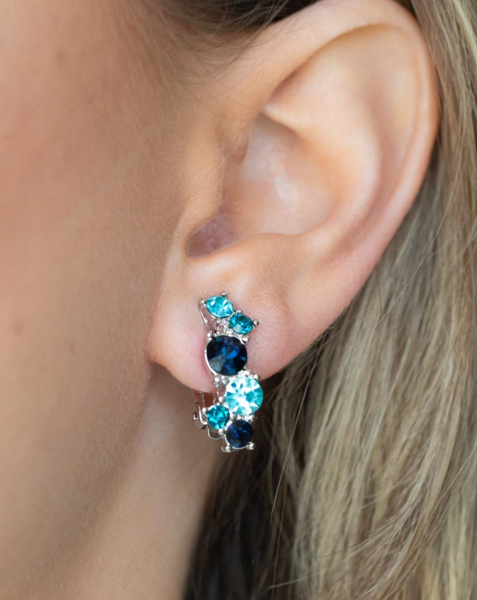 Varying in shades of blue, mismatched rhinestones delicately coalesce into a dainty frame for a colorfully sparkly display. Earring attaches to a standard clip-on fitting.
