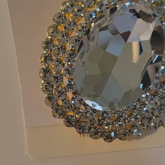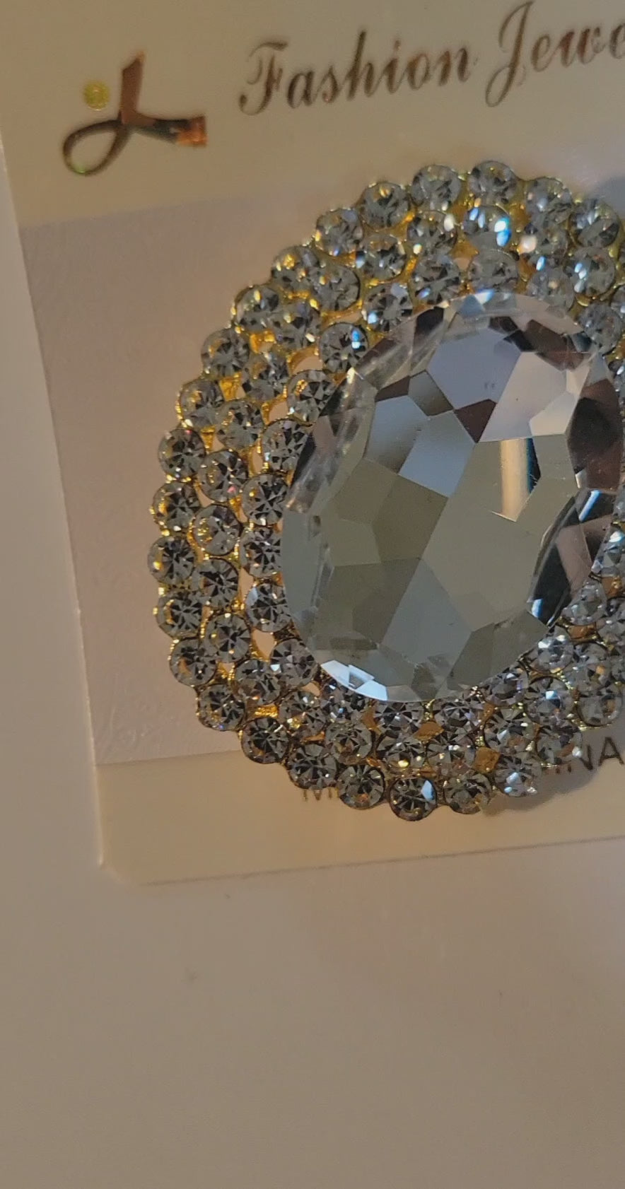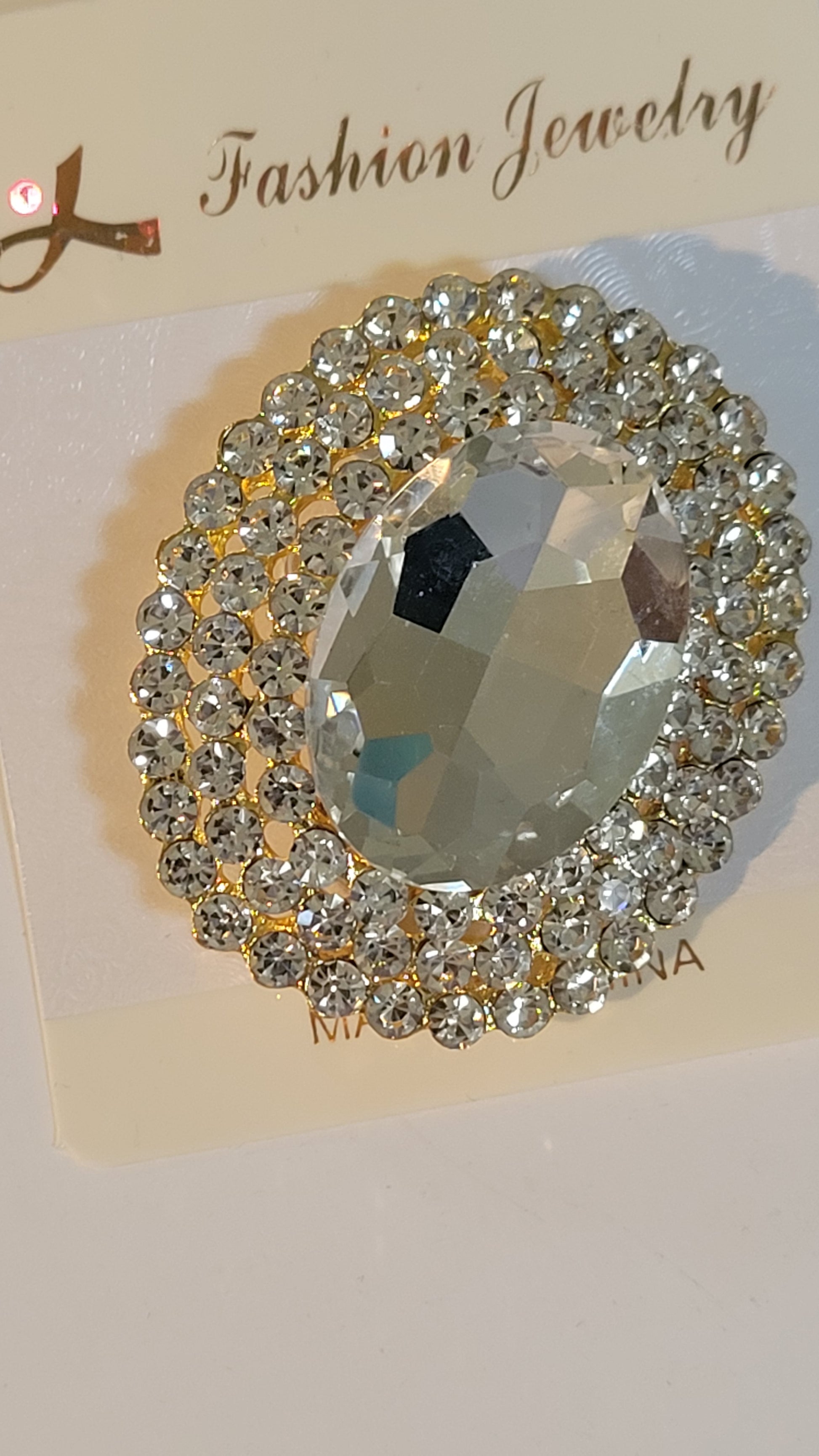 Beautiful Oval shaped Clothing pin. Large clear stone Encrusted with small round clear stones . gold background