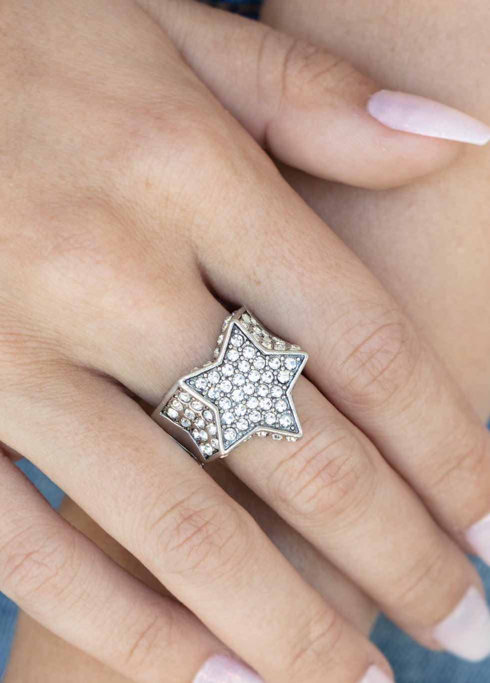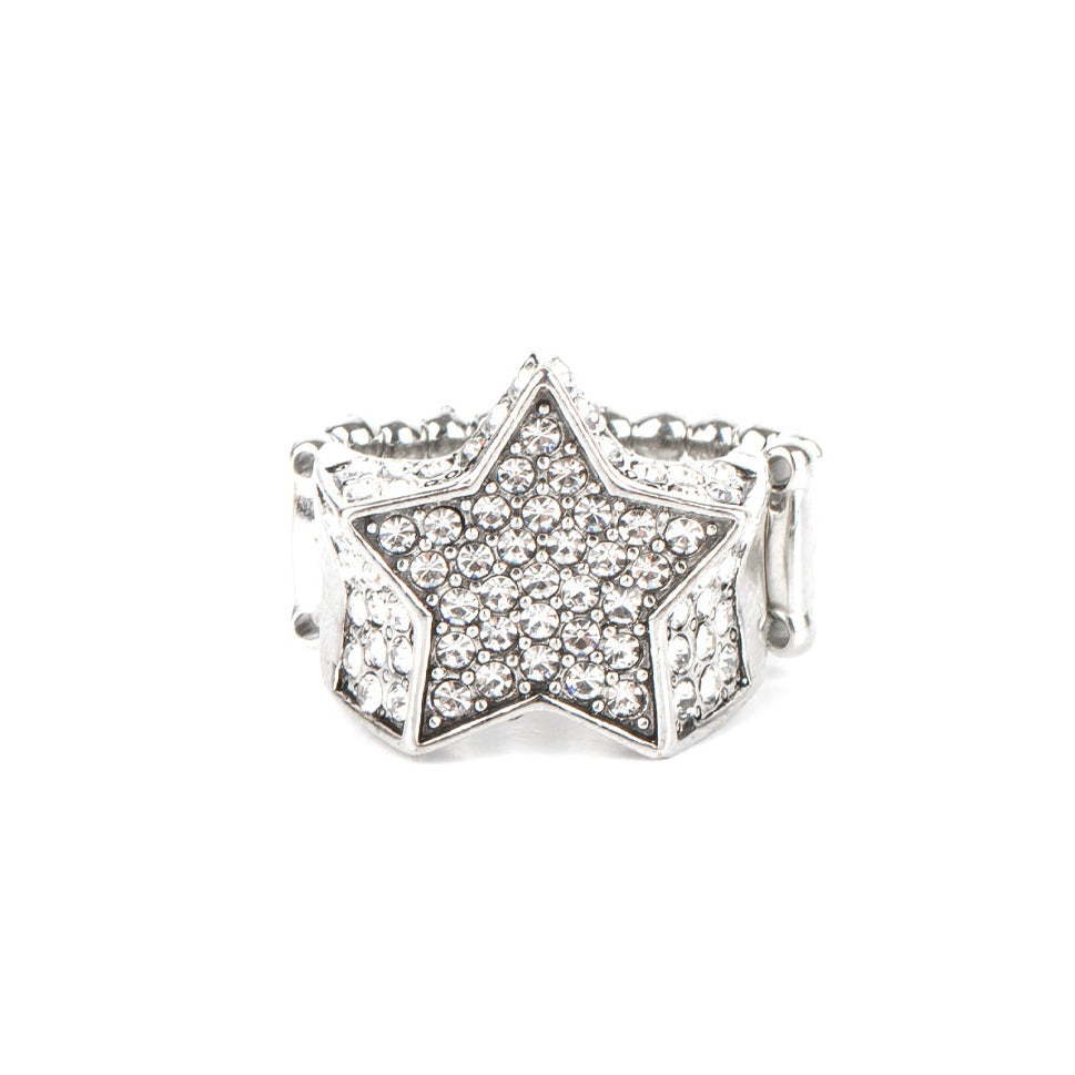 Encrusted in glittery white rhinestones, a sparkly silver star joins with a thick band of blinding white rhinestones. The edges of the star are embellished in additional white rhinestones, creating a stellar centerpiece atop the finger. Features a stretchy band for a flexible fit.