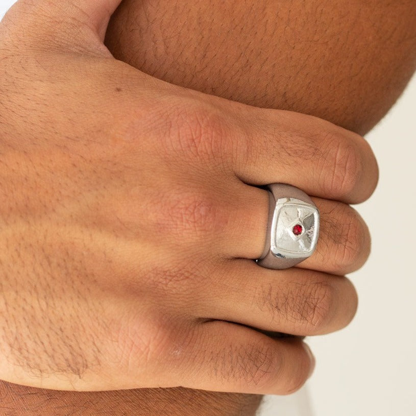 A solitaire red rhinestone is pressed into the center of a flattened square frame for a statement look. Features a stretchy band for a flexible fit.
