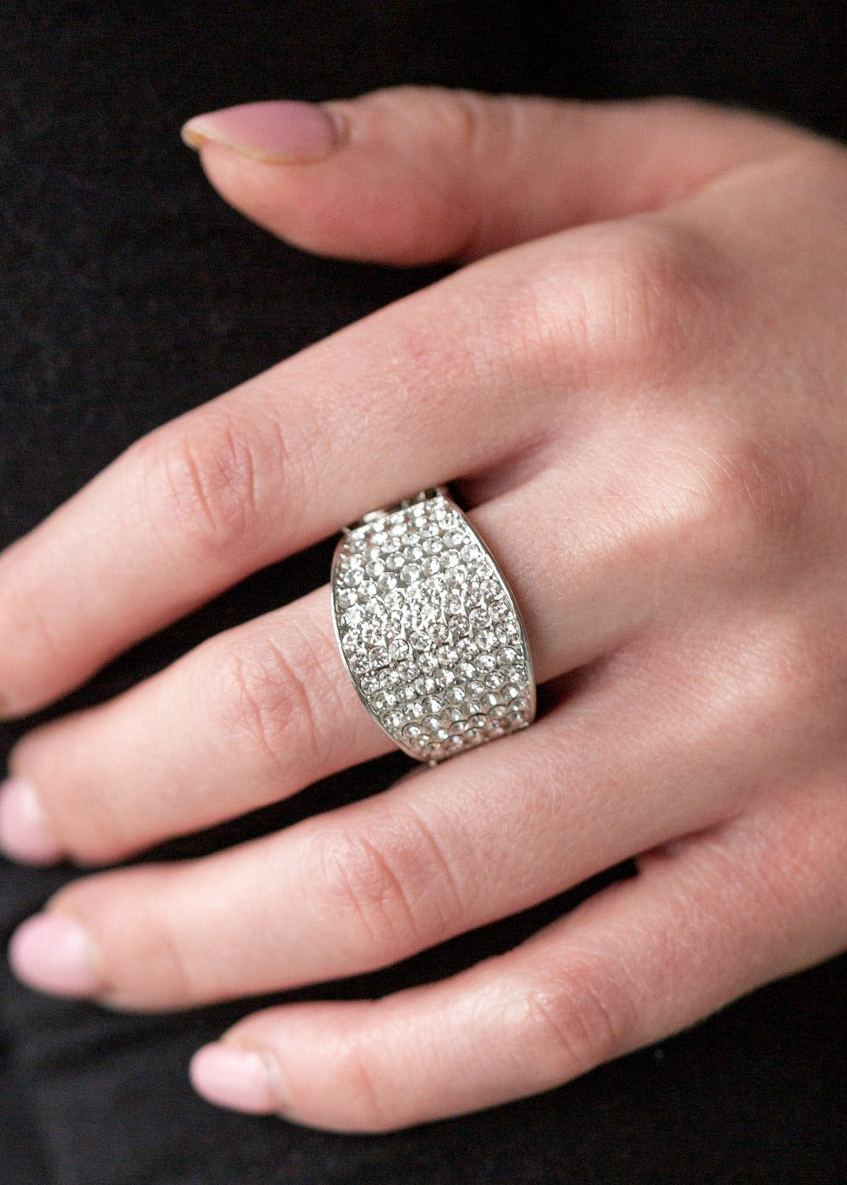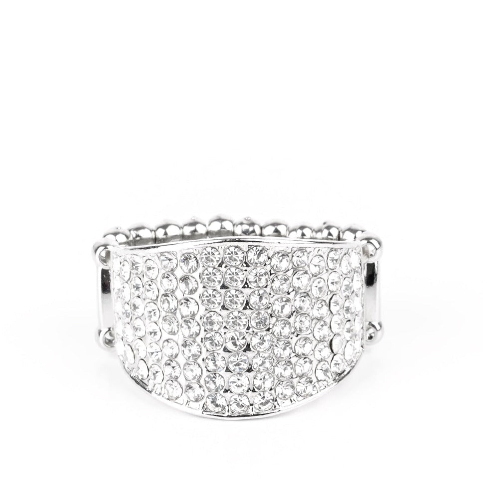 Countless white rhinestones are encrusted along a thick silver band for a spellbinding look. Features a stretchy band for a flexible fit.