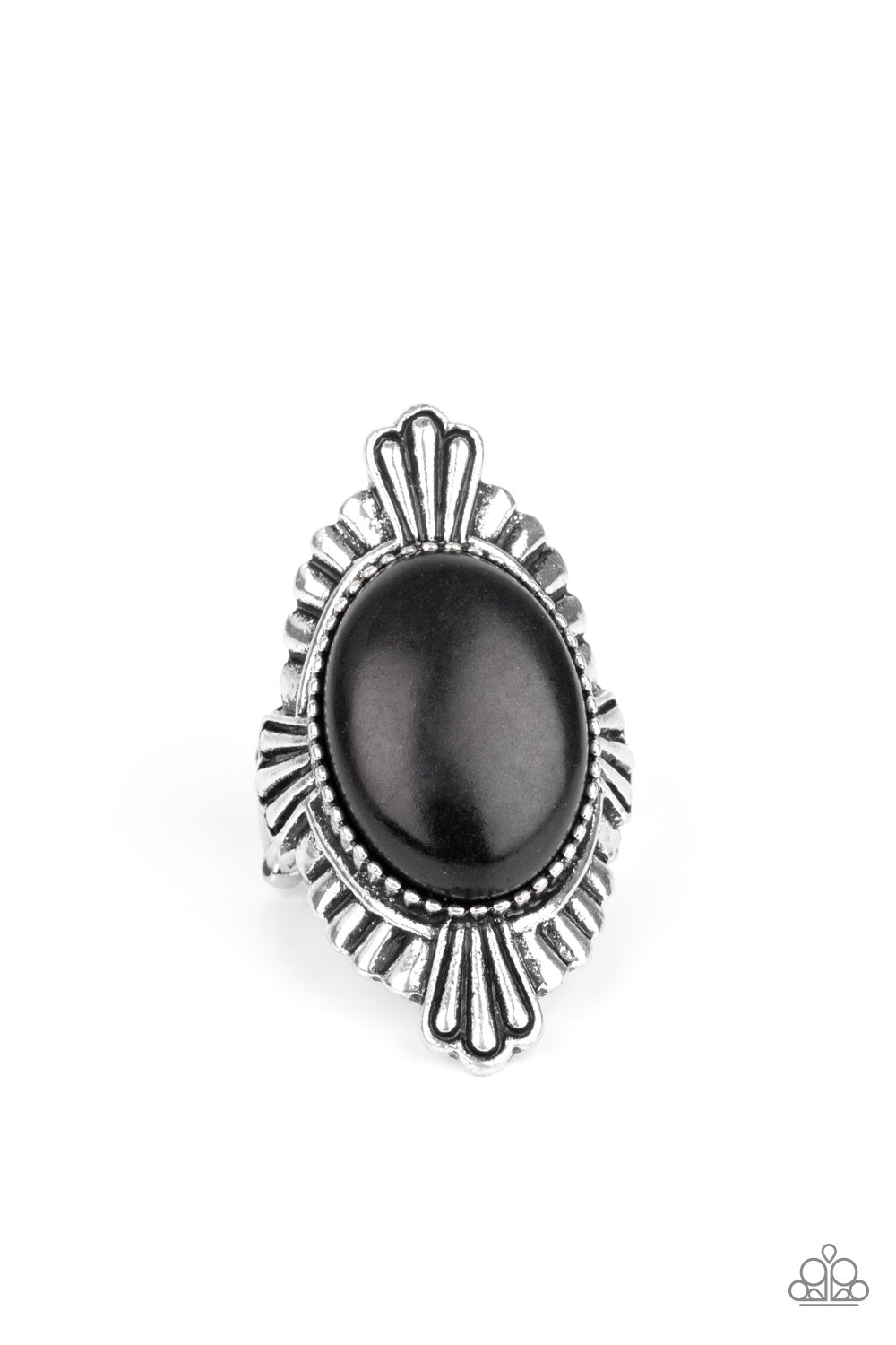 Featuring antiqued linear textures, a scalloped silver frame flares out from a dramatically oversized black stone center for a seasonal look. Features a stretchy band for a flexible fit.