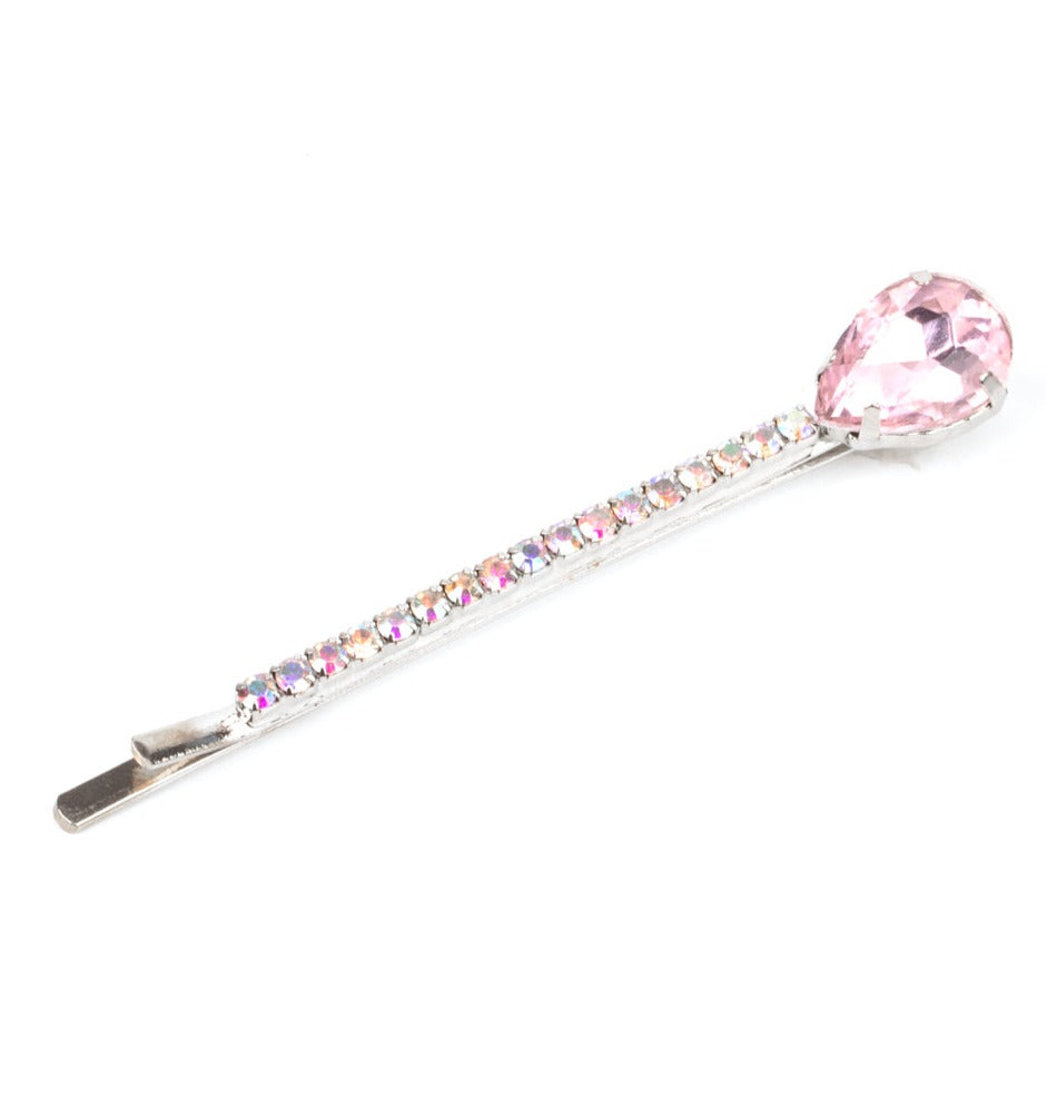 A pink teardrop gem adorns the corner of a bobby pin that is adorned in opalescent rhinestones for a glamorous finish.
