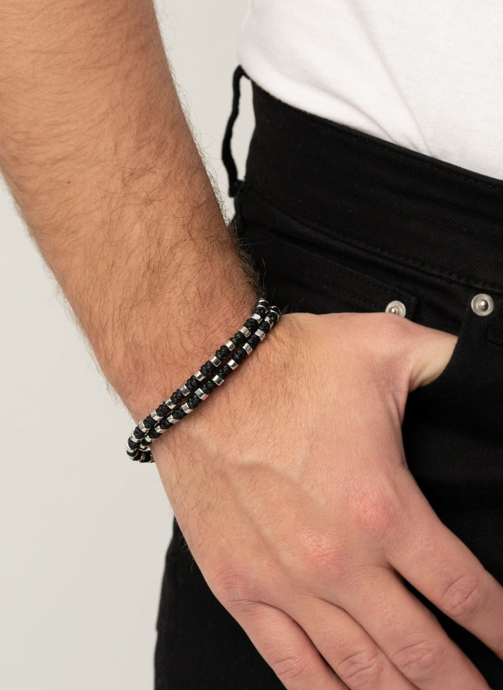 Dainty silver rings adorn a knotted black cord that double wraps around the wrist, creating edgy layers. Features a button loop closure.