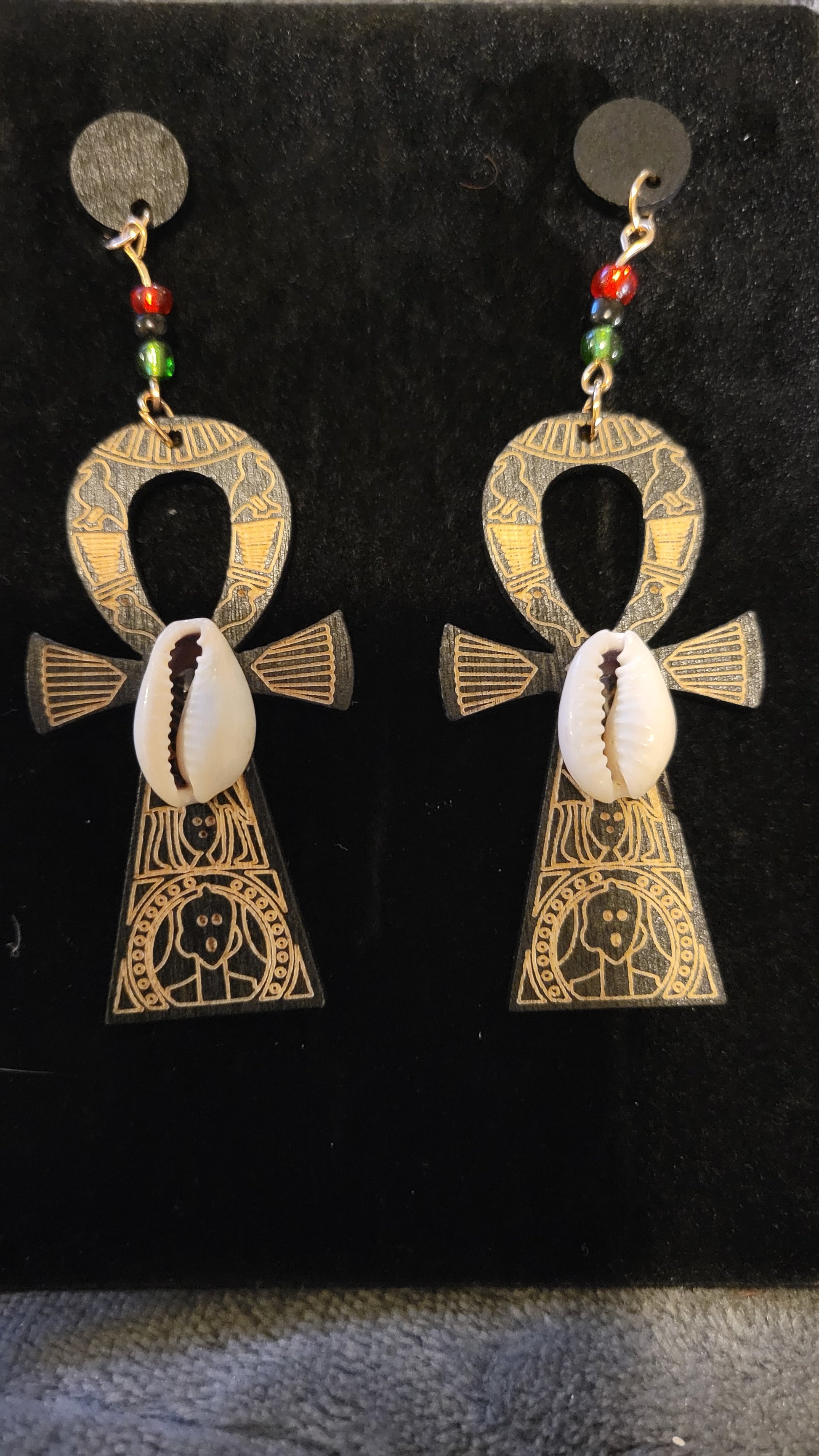 Small hand crafted wood Ankh Earrings w Corwy shell,