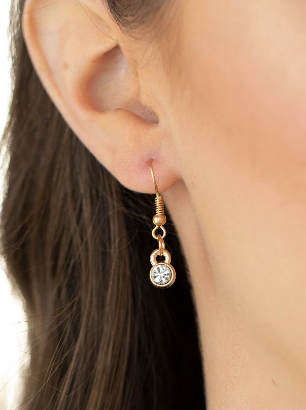 A solid gold ring entwines with a brilliant white rhinestone encrusted ring. The pair of rings rest in a gold hoop on a short round gold chain. Features an adjustable clasp closure.